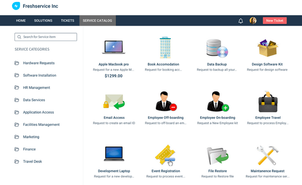 The service catalog in Freshservice ensures that employees do not have to fill out lengthy forms and the sections are designed to save time and be as user-friendly as possible. Whether they require access to tools such as MS Office or a tangible item like a laptop, the employee can find it in the service catalog.