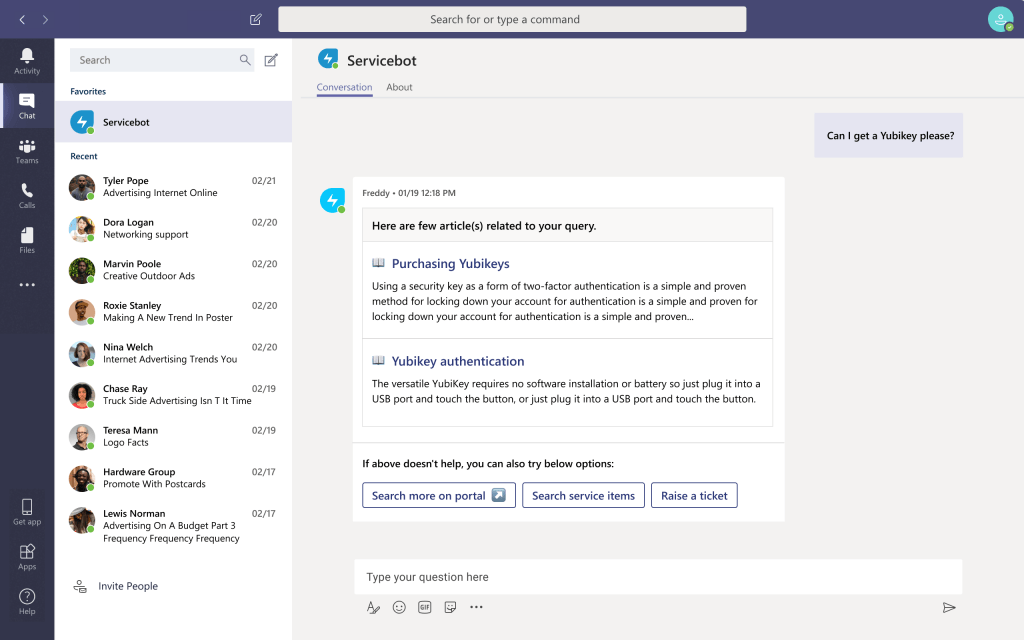Freshservice virtual agent is pre-trained on the most common IT service management (ITSM) and Enterprise service management (ESM) use cases using our AI-powered platform – Freddy. Employees can get instant response and resolution to their IT issues, while agents save more time and can focus on resolving complex and high-value issues.