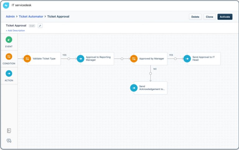 2. Powered by automation: Manually intensive low-priority tasks can be replaced by automation for a quicker and more efficient ticket resolution process. Artificial Intelligence allows for tickets to be routed to the right person or team. Automation is a great way to put a unified process in place to meet the service demands of employees. This also saves time for your IT teams, as they are not preoccupied with routine manual tasks and can prioritize more important activities. As a whole, tickets are closed faster and the business operates more smoothly.